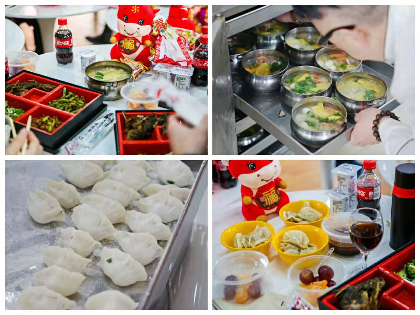 在欢乐喜庆的新春音乐声中,校领导、老师们与同学们共进午餐,分餐分食“程园全家福”小火锅,并配有美味水饺、特色小吃、精致点心、水果。席间,校领导们为留校学生送上“新春大礼包”“防疫物资大礼包”“新年吉祥物”。