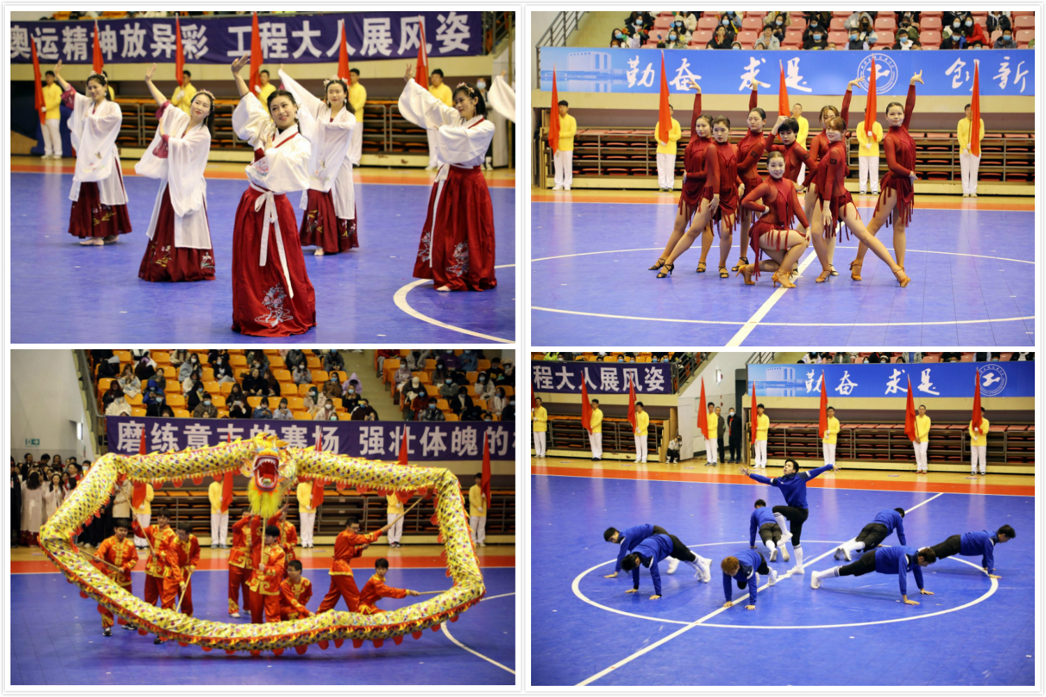 开幕式节目展演上,舞龙表演《腾飞中国》及来自教工社团的《霓裳羽衣映风华》弘扬了中国传统文化,展示了工程大人对文化自信的深刻理解;来自学生社团的《舞动青春》和学生艺术团的《攀登》体现了工程大学子的青春活力,展示了我校“五维育德”育人成果;来自各个部门的教工广播操,用整齐划一的动作传递出了工程大教工们健康的气质和良好的精神风貌。精彩的表演展现了工程大师生健康拼搏、奋发向上的风采,引得观众热烈阵阵掌声。