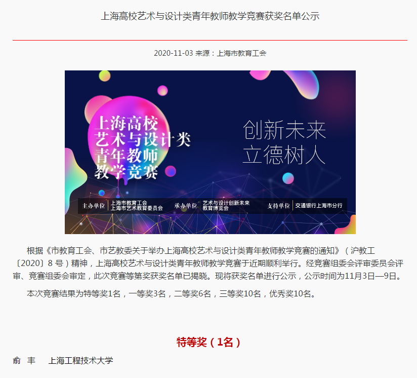 根据《市教育工会、市艺教委关于举办上海高校艺术与设计类青年教师教学竞赛的通知》(沪教工〔2020〕8 号)精神,上海高校艺术与设计类青年教师教学竞赛于近期顺利举行。经竞赛组委会评审委员会评审、竞赛组委会审定,我校中韩多媒体设计学院俞丰老师获特等奖。