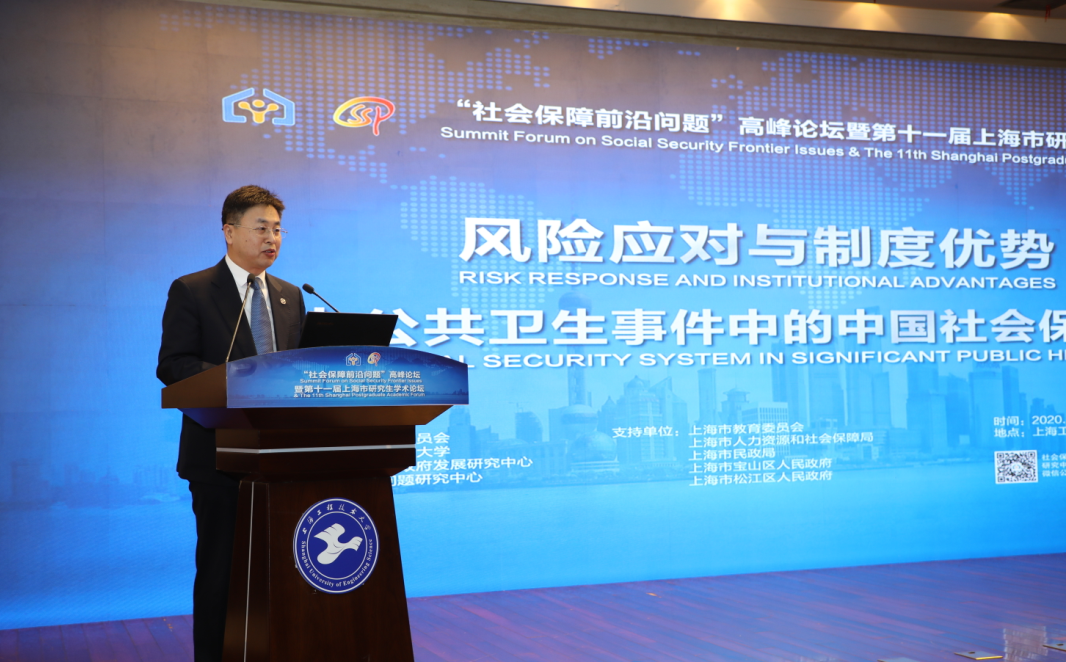 10月31日至11月1日,由中国社会保障学会指导,上海市学位委员会主办,上海工程技术大学、上海社会保障问题研究中心、上海市政府发展研究中心 —— 上海工程技术大学“政府公共决策支持”研究基地承办的“社会保障前沿问题”高峰论坛暨第十一届上海市研究生学术论坛在我校成功举行。校党委书记李江教授,中欧国际工商学院院长、上海社会保障问题研究中心主任汪泓教授,上海市民政局朱勤皓局长以及来自北京大学、清华大学、中国社会科学院、上海交通大学、浙江大学、武汉科技大学、上海理工大学以及民政部、宝山区相关政府部门、上海建信养老金管理有限责任公司等高校、政府、企业有关部门等20余位专家、领导出席论坛。党办、校办、研究生处、管理学院全体党政领导及研究生导师、研究生以及来自全国各地高校的近200位硕士博士研究生参加论坛。与会人员围绕“风险应对与制度优势:重大公共卫生事件中的中国社会保障制度”共同展开研讨。