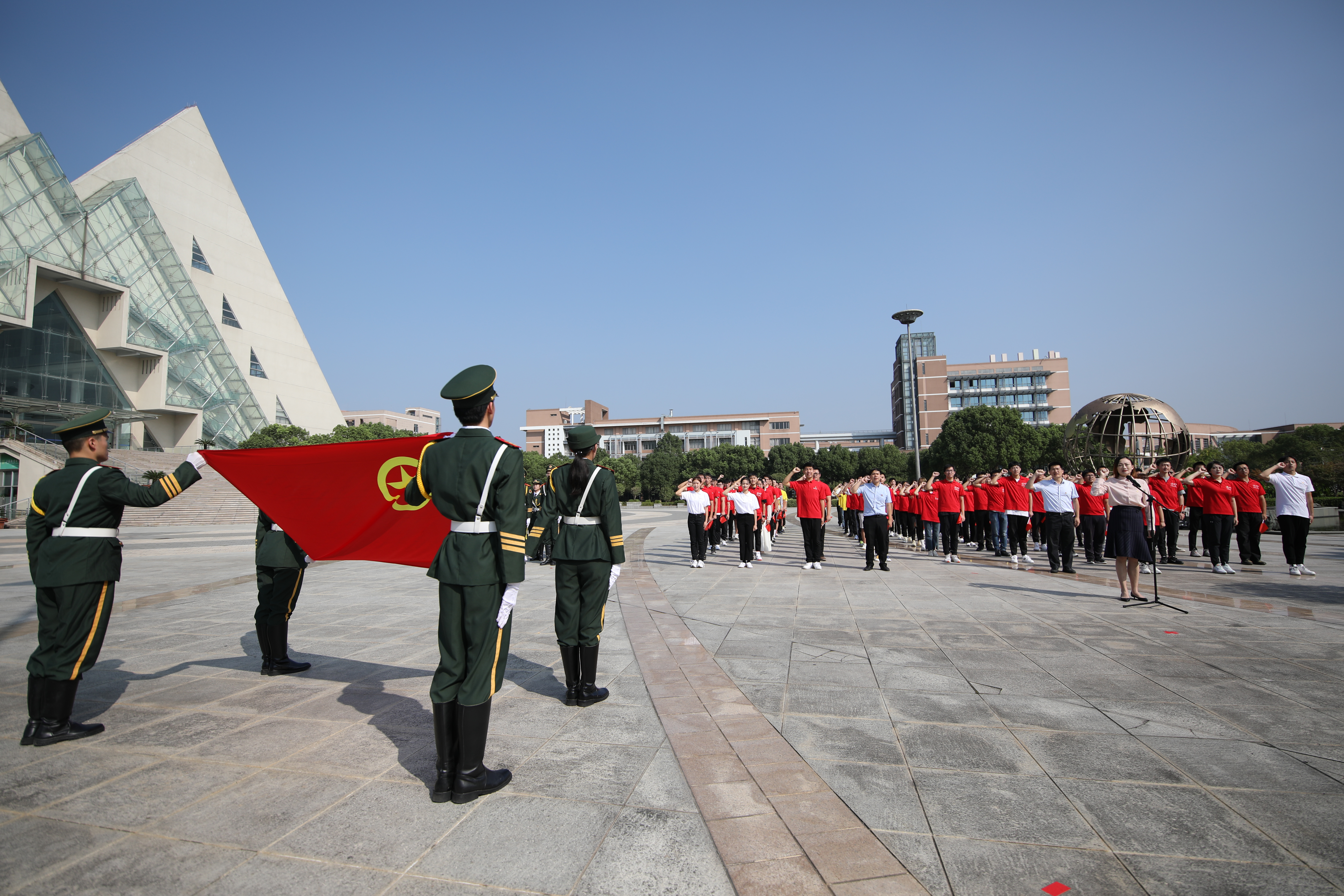 10月1日上午,学校在松江校区博学广场举行“青春在国旗下绽放”庆祝中华人民共和国成立七十一周年升旗仪式。校团委班子成员、国旗护卫队成员、各学生组织负责同学及200余名青年师生参加了本次活动。