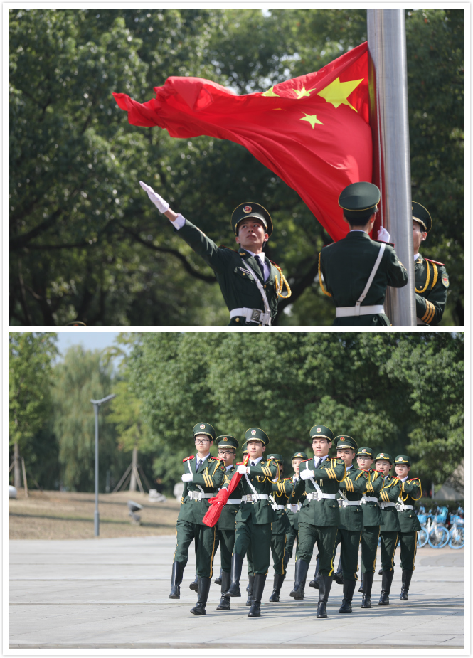 上午9时,英姿飒爽、意气风发的国旗护卫队成员迈着整齐、有力的步伐护送国旗入场。伴随庄严嘹亮的国歌声,五星红旗冉冉升起。现场师生向国旗行注目礼,高唱国歌,表达对伟大祖国七十一周年诞辰的诚挚祝福。
