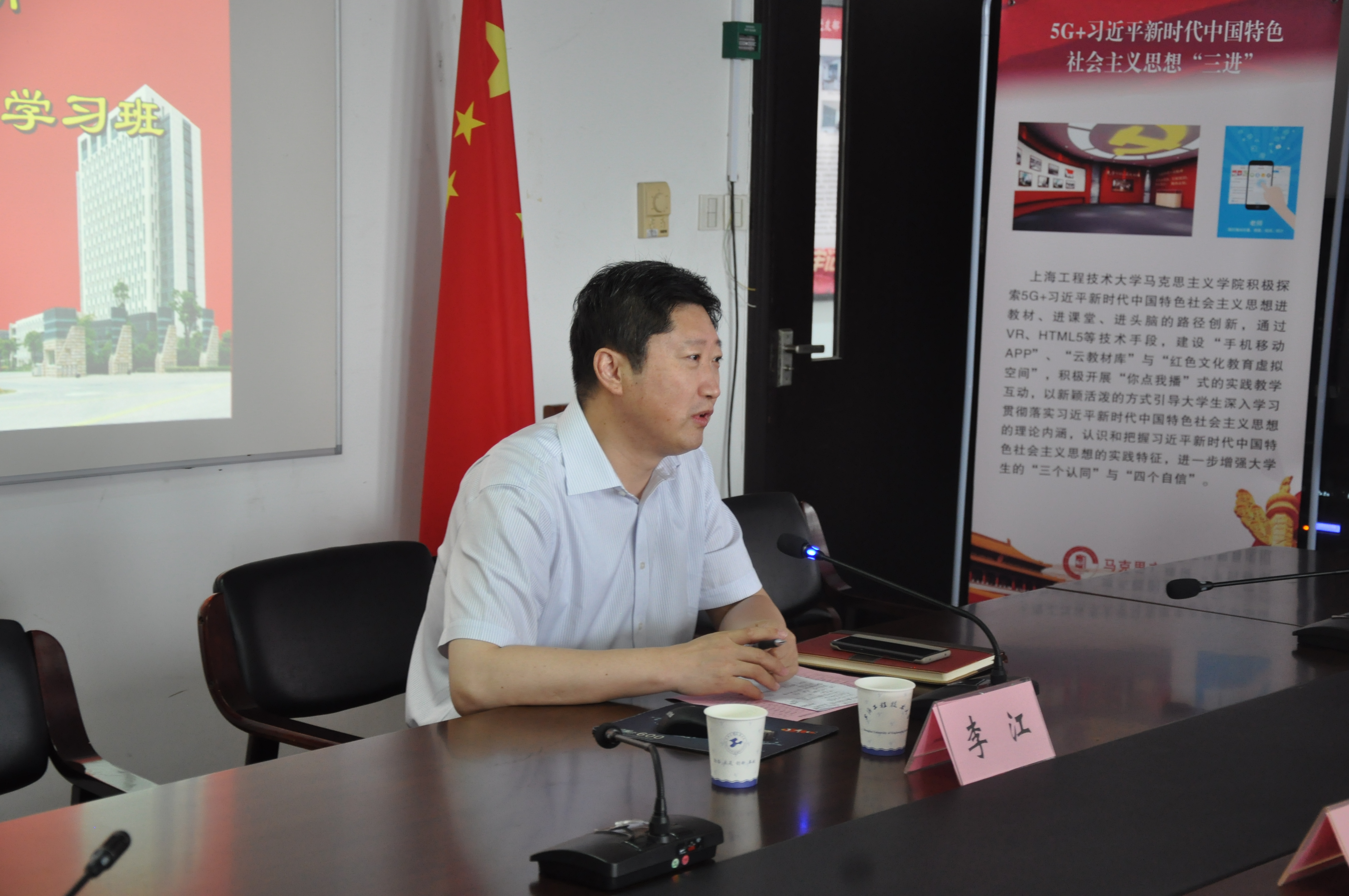 在开班仪式上,李江书记作了题为“思政课程与课程思政的协同发展及应用创新”的精彩报告。李书记从新时代带来新契机、新思想引领新发展、新技术推动新理念三个方面凸显出马克思主义学院面临的前所未有的发展机遇,紧紧围绕着“课程思政”改革这条主线,深入分析“课程思政”改革的理念与思路,分享了“课程思政”改革在上海各高校的实践与创新案例,从宏观、中观、微观三个维度探讨了“课程思政”改革在高等学校的行动层次,并结合我校人工智能产业研究院王国中教授研发的ICLASS智慧教学平台,对“课程思政”改革和拓展方向进行了详细介绍。