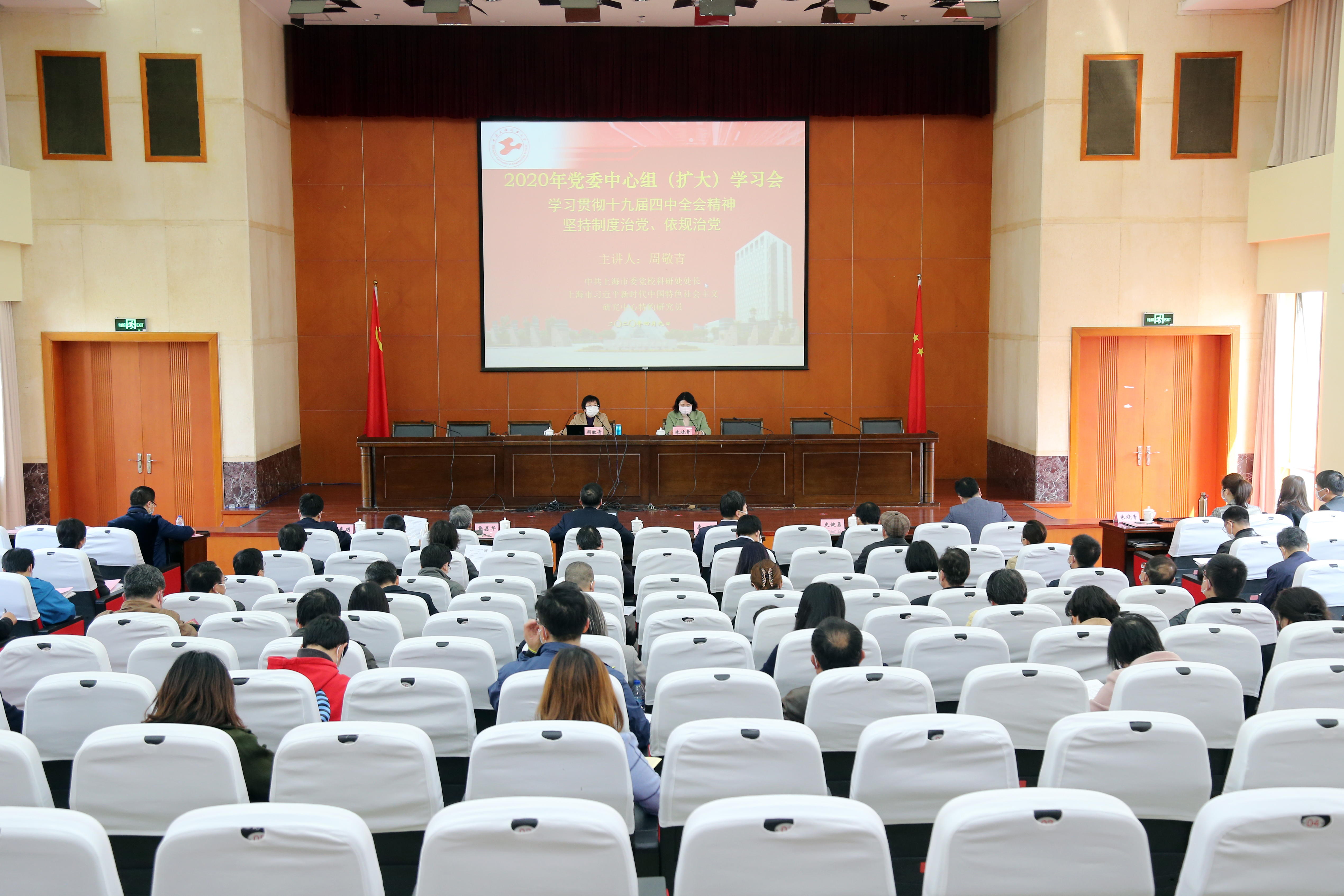 为深入学习领会十九届四中全会精神,推动全校党员、干部进一步提高政治站位,牢固树立“四个意识”,坚定“四个自信”,不折不扣落实全面从严治党责任要求, 4月9日下午,校党委中心组在行政楼B301会议室及图文信息中心第二报告厅举行了专题学习会,中共上海市委党校科研处处长、上海市习近平新时代中国特色社会主义研究中心特约研究员周敬青教授为我们作专题辅导报告及相关政策解读。校党委中心组成员、中层干部、相关部门科级以上干部、各学院党政办公室主任等200余人参加会议,党委副书记、副校长朱晓青主持会议。