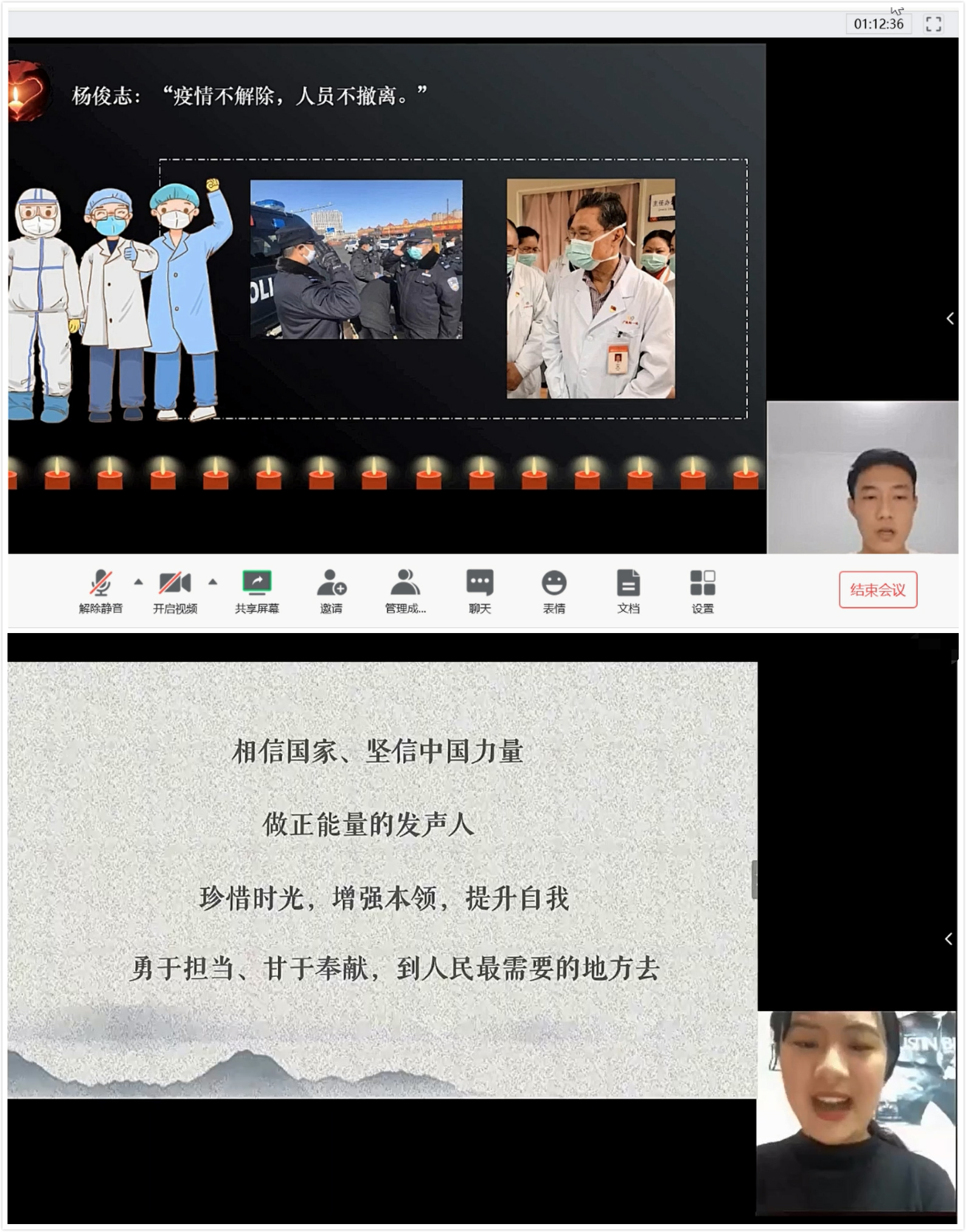 上午10点,防空警报响起,学校降半旗,全体师生肃穆而立,默哀3分钟,以沉重的心情表达对抗击疫情中牺牲的烈士及逝世同胞的悼念,深深缅怀他们为打赢这场防疫阻击战付出宝贵生命的崇高精神。默哀礼毕,师生们在线开展了悼念交流。