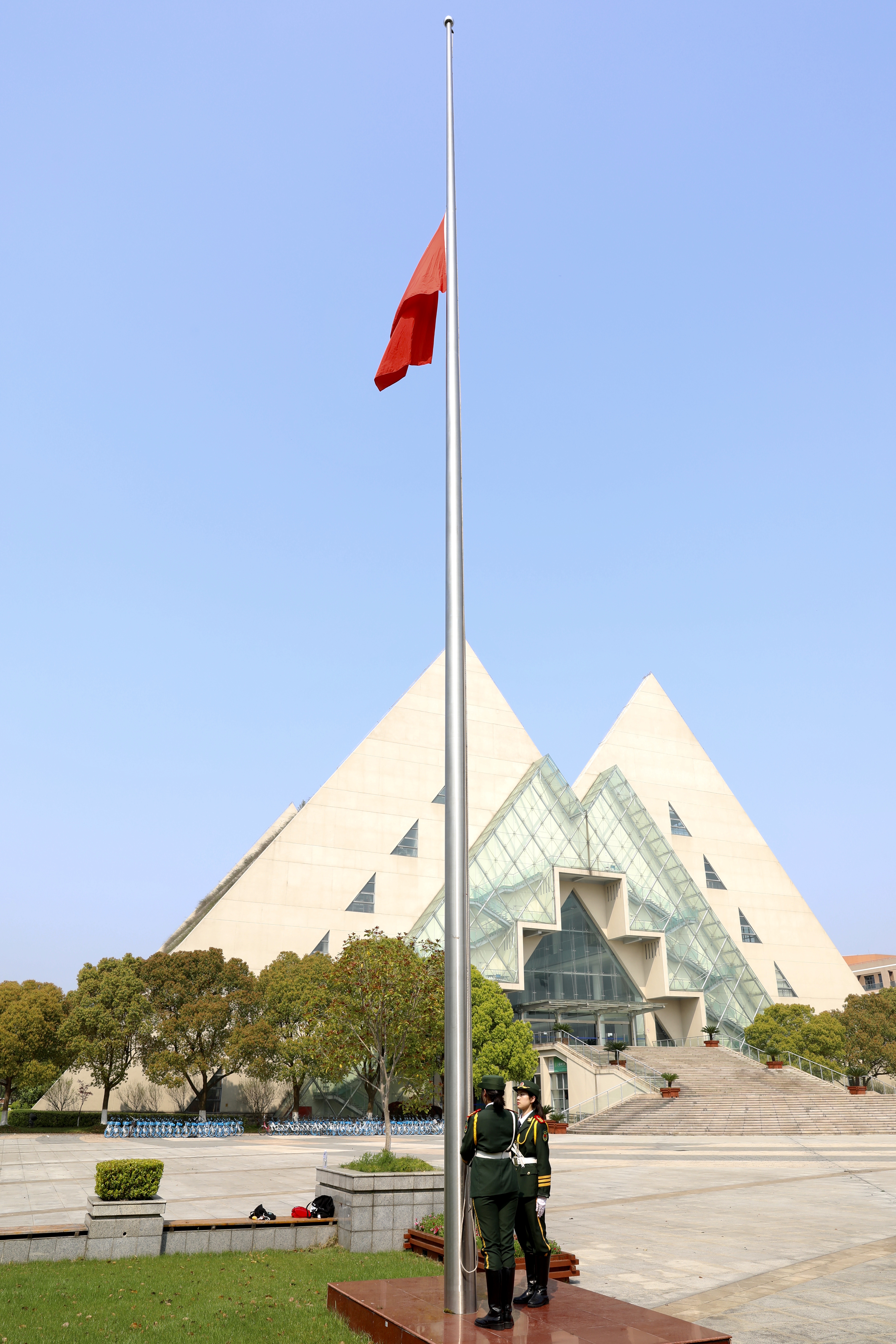为表达对抗击新冠肺炎疫情牺牲的烈士和逝世同胞的深切哀悼,4月4日清明节上午,学校在松江校区博学广场举行悼念仪式,并通过网络向全校师生直播活动全程。在校师生代表、海外交流学生代表、志愿者代表共计千余人观看、参与悼念。活动由校团委书记董旖旎主持。