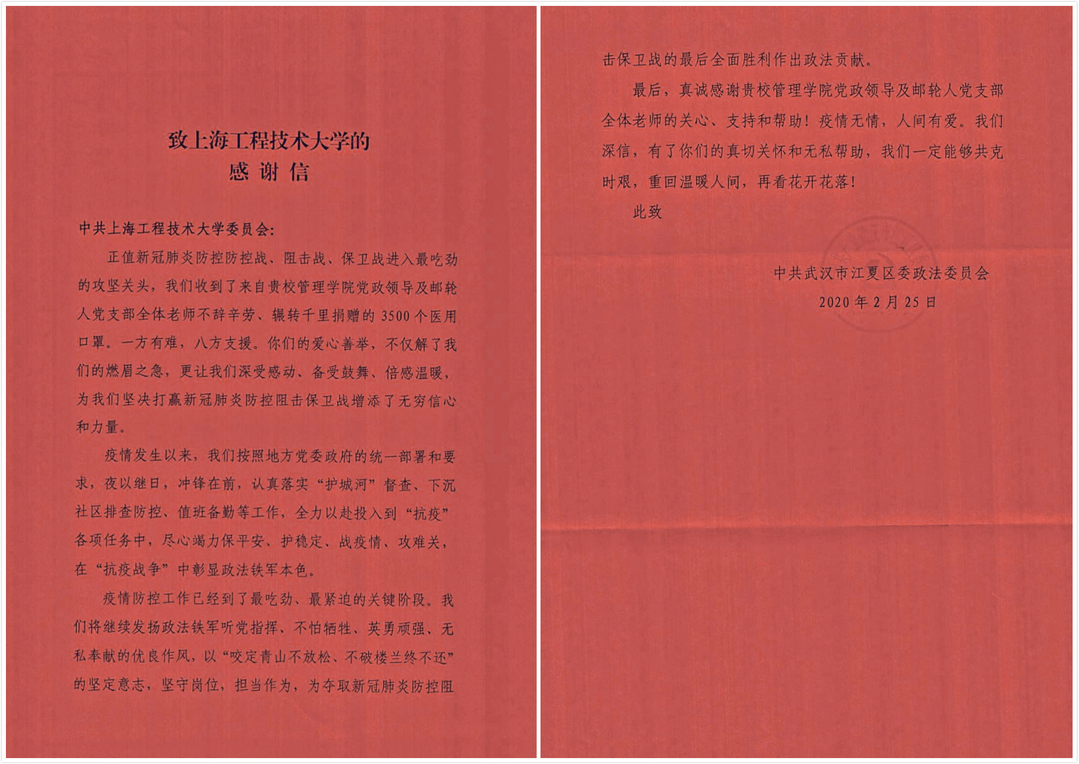 近日,中共上海工程技术大学委员会收到了一封来自武汉市江夏区委政法委员会的感谢信。这封来自武汉防疫一线的感谢信,对我校管理学院党委及邮轮人党支部辗转千里捐赠3500个医用口罩,缓解抗疫一线燃眉之急的爱心善举表示真挚感谢。