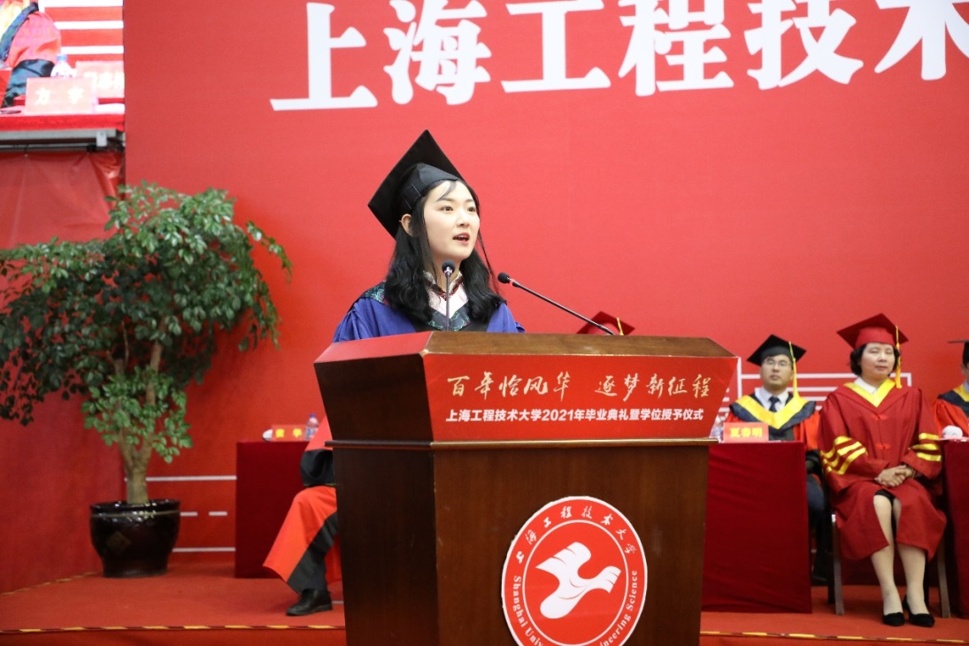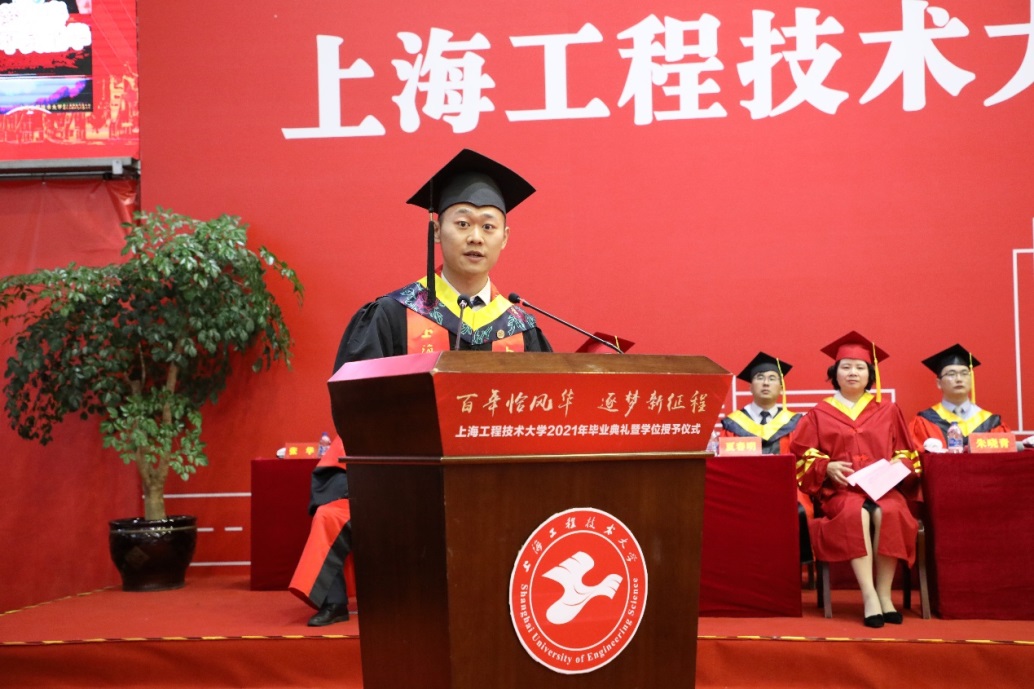 上海市学联驻会执行主席、机械与汽车工程学院2017级车辆工程专业毕业生王泽林同学代表全体本专科毕业生发言,他回顾了自己在校四年的实践故事和研学经历,表达了对母校的感恩之情,表示要带着对母校美好的记忆和感恩的心,开启多彩人生新征程。