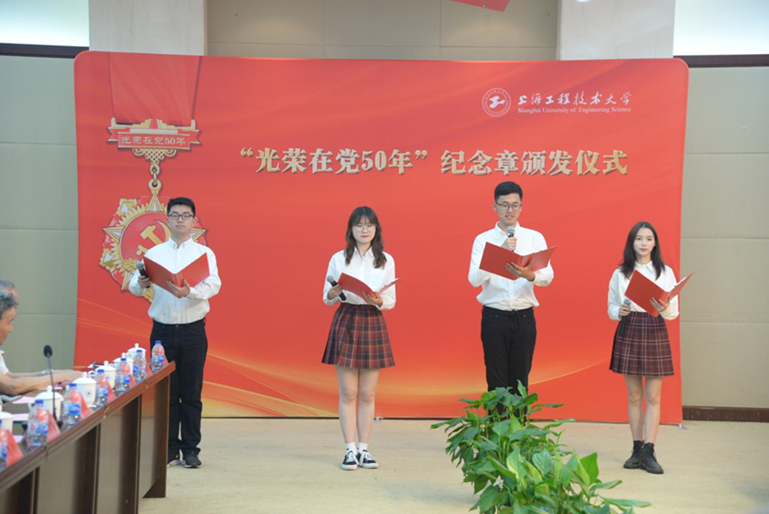 原上海工程技术大学物资正处级调研员陈俊鳌老师表达了领取纪念章的激动心情。他说,“我是在党的教育领导下成长起来的,为党做了一点工作,党给予了很多的荣誉。我要继续发挥党员的先锋模范作用,坚定政治品质、坚定理想信念,永远听党话,跟党走。”