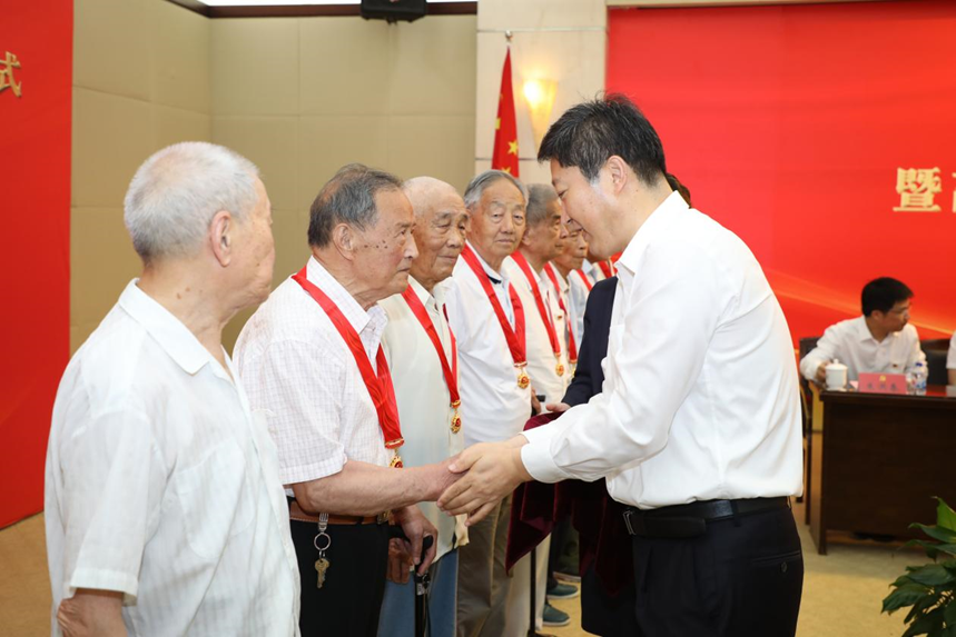 2021年,党中央决定首次颁发“光荣在党50年”纪念章,这项工作是中国共产党成立100周年庆祝活动的重要组成部分,对于增强党员的荣誉感、归属感、使命感,汇聚全党为全面建设社会主义现代化国家持续奋斗,具有十分重要的意义。今年我校共有178名老党员获颁“光荣在党50年”纪念章。会上,校党委书记李江为离退休党员代表颁发了纪念章,并代表学校党委向所有纪念章获得者表示热烈的祝贺和崇高的敬意。新入党党员向光荣在党50年的老党员献花。