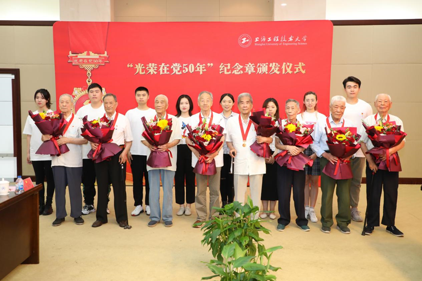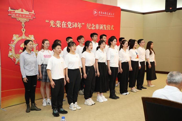 全体校领导与获颁“光荣在党50年”纪念章离退休党员代表合影。会上,青年学生朗诵《一生向党 初心如磐》、新入党党员合唱《祖国不会忘记》,向“光荣在党50年”的离退休党员致敬。