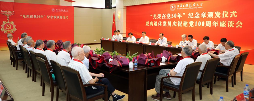 6月15日下午,学校党委在松江校区图文信息中心三报举行“光荣在党50年”纪念章颁发仪式暨离退休党员庆祝建党100周年座谈会。获颁纪念章的离退休党员代表,全体校领导、党务相关部门负责人、二级党组织书记代表、新党员代表等出席会议。会议由校党委副书记、校长俞涛主持。