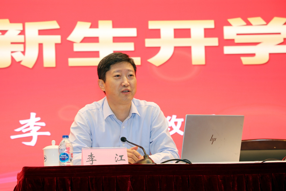 李江书记代表学校对2021级新同学的到来表示热烈欢迎,祝贺大家加入上海工程技术大学,开启人生新征程。他首先从“ 爱校荣校,选择工程大就是选择了责任”引入,讲述了上海工程技术大学四十多年筚路蓝缕、风雨兼程的办学路以及与党同行、与国共进的奋斗史,勉励同学们努力成为卓越的工程师、卓越的管理人才、卓越的设计人才,服务国家经济和社会发展。