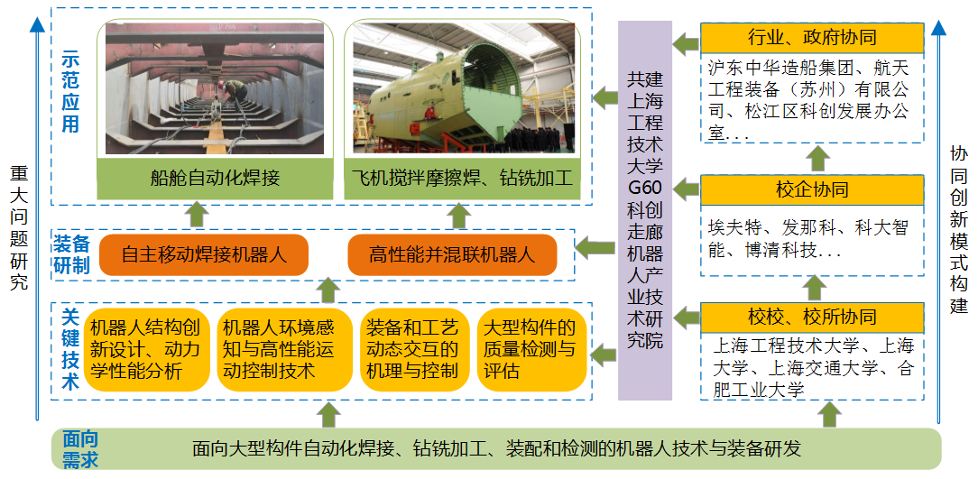 协同创新中心构建了“两层次、多形式、实体化”的协同创新模式,学校与上海交通大学智能焊接与精密制造研究所、上海大学智能制造及机器人重点实验室、合肥工业大学机器人研究所等密切合作,与埃夫特智能装备有限公司、上海发那科机器人有限公司、中电科机器人有限公司等单位协同攻关,建立了功能互补、良性互动的产学研协同体。我校机器人研究所科研团队与协同单位前期合作成功研制了爬行式智能焊接机器人装备,在中石化200台储罐焊接等工程中应用,填补国内空白;开展复杂构件曲线焊缝重载混联机器人搅拌摩擦焊技术研究,研发了机器人化搅拌摩擦焊装备并进行了工程应用。