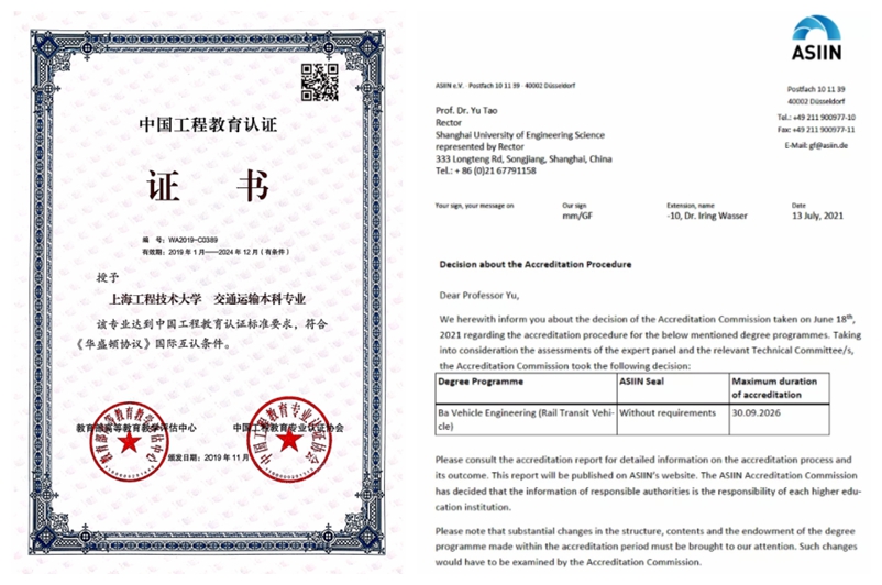 学院鼓励和组织各个专业积极参与教育部工程教育认证及工程专业国际的认证,根据专业认证标准改进课程体系,改造相关教学环节和设施。将认证工作的成果导向教育理念作为专业建设、人才培养等各项工作中的突破口,推动专业建设和整体教学水平再上新台阶。学院交通运输专业于20191月顺利通过教育部工程教育认证;车辆工程(城市轨道交通车辆)专业于20217月一次性“无条件”通过ASIIN认证,有效期为6年,也是我校首个开展并通过国际专业认证的专业。轨道交通信号与控制、铁道工程专业也已启动国际ASIIN认证。