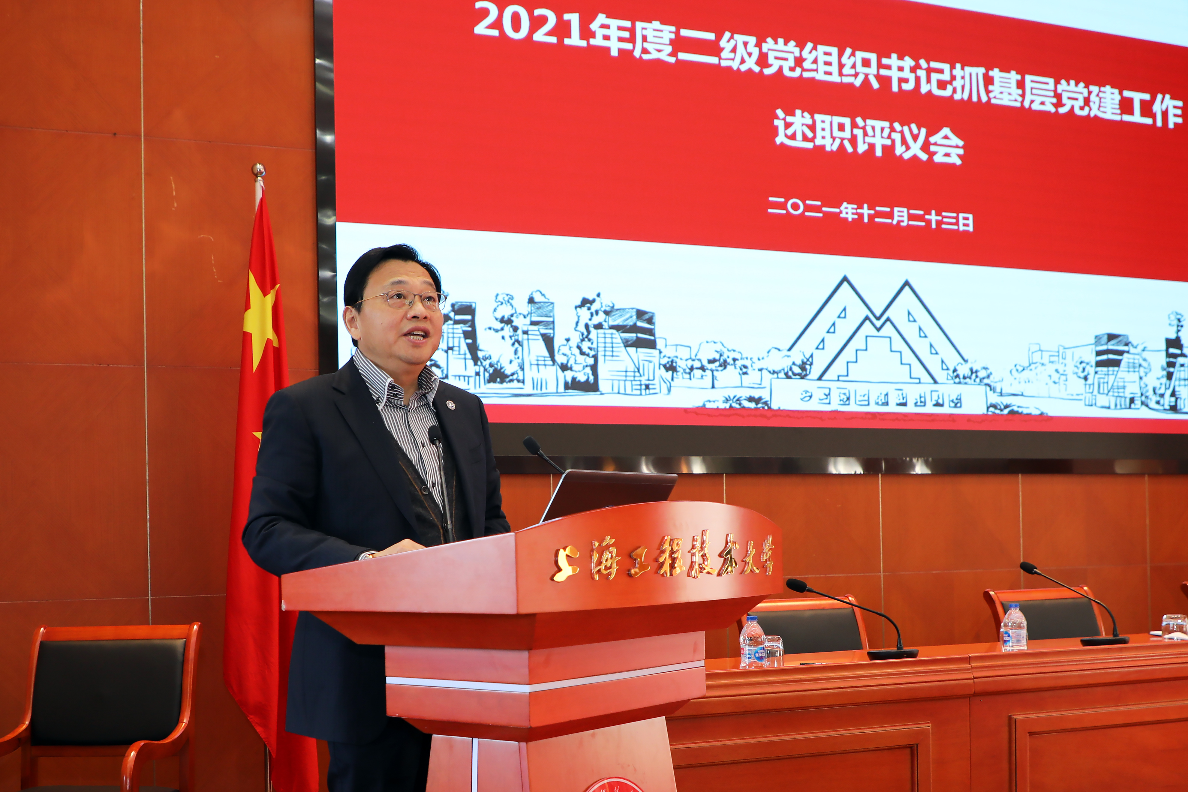 1223,学校党委在行政楼B301召开2021年度二级党组织书记抓基层党建工作述职评议会。全体校领导,两委委员,党务职能部门负责人,二级党组织书记、副书记、组织员,学校“两代表一委员”代表,党代会、教授、民主党派代表出席会议。会议由校党委副书记、工会主席史健勇主持。