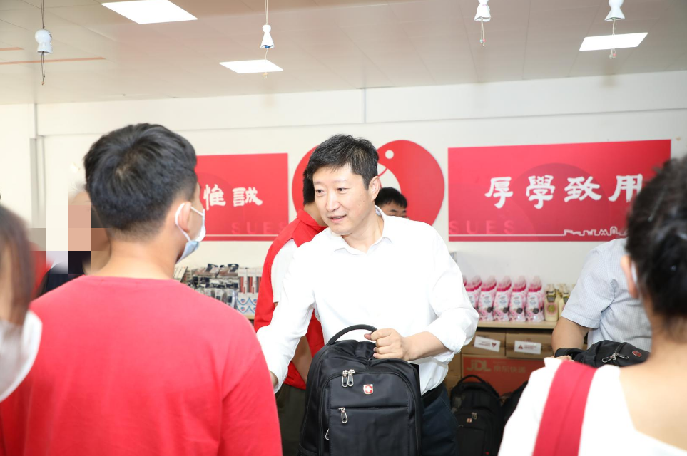 在三期10号楼爱心屋,校党委书记李江为新同学发放“爱心大礼包”, 助力新生开启新生活。李江书记视察了一楼一品学生公寓 ,并为“凌云楼”揭牌,鼓励同学们勤业惟诚,厚学致用,祝福他们在工程大度过充实快乐的大学时光。