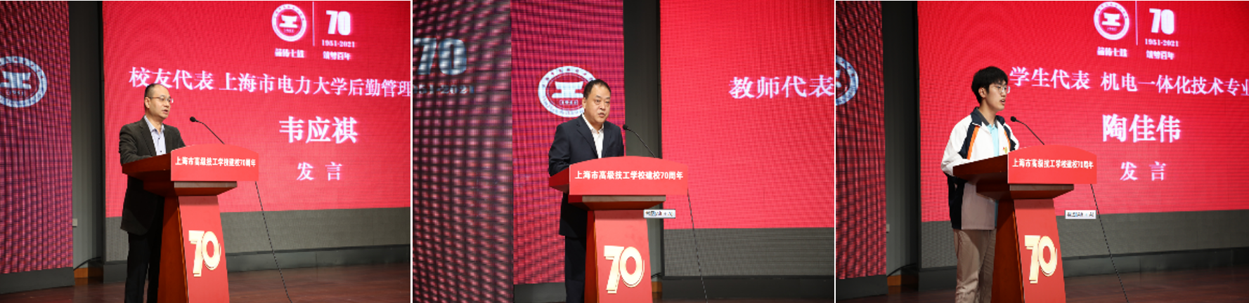 校友代表上海电力大学后勤处副处长韦应祺、2020年上海市“四有”好教师(教书育人楷模)提名奖获得者黄晓峰老师以及机电一体化技术专业陶佳伟同学分别作为校友代表、师生代表发言。