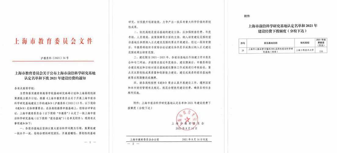 近日,上海市教委公布了前沿科学研究基地认定名单,我校化学化工学院牵头申报的上海市心脑血管非编码RNA成药性前沿科学研究基地(培育)获批立项,建设周期为2021-2025年。