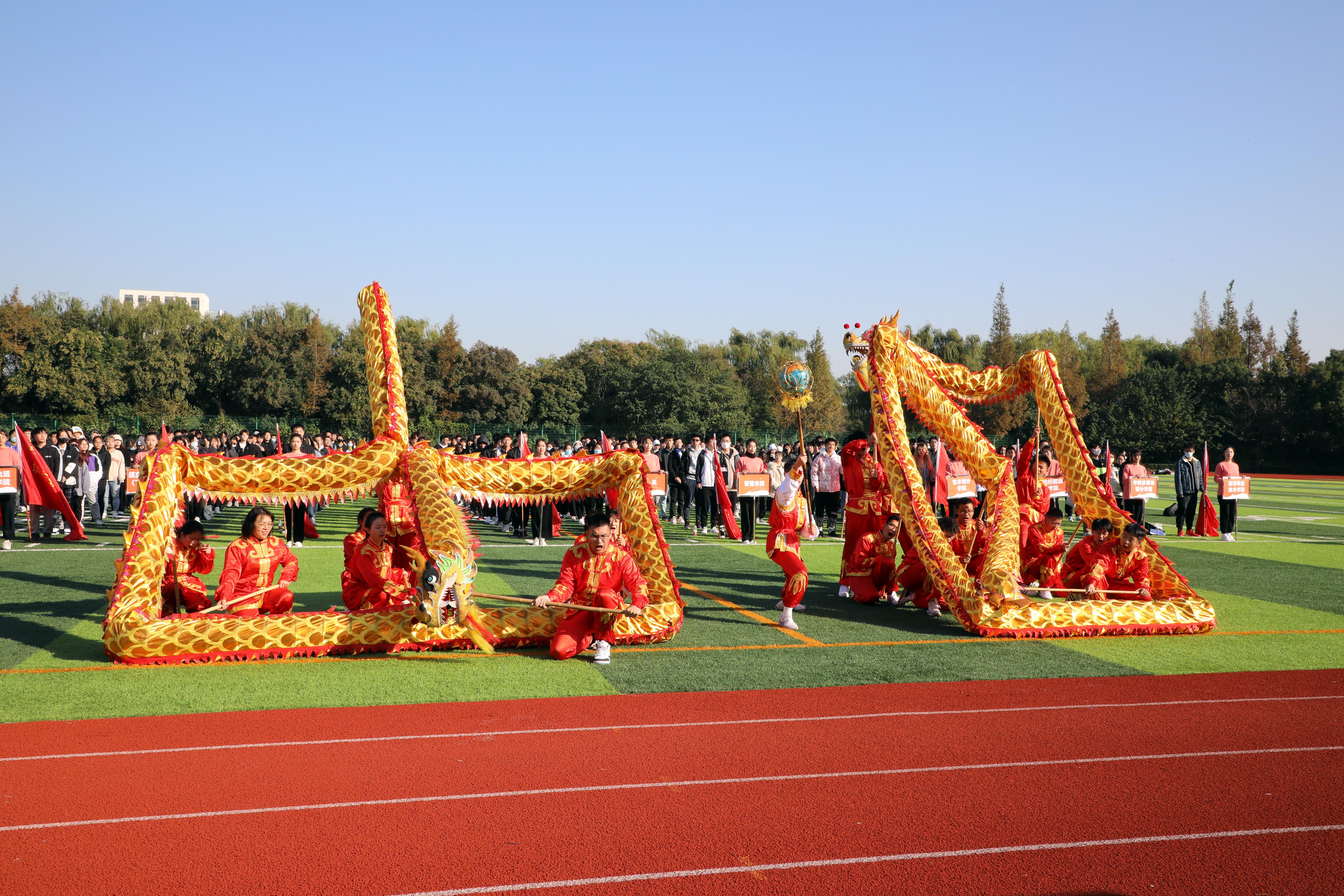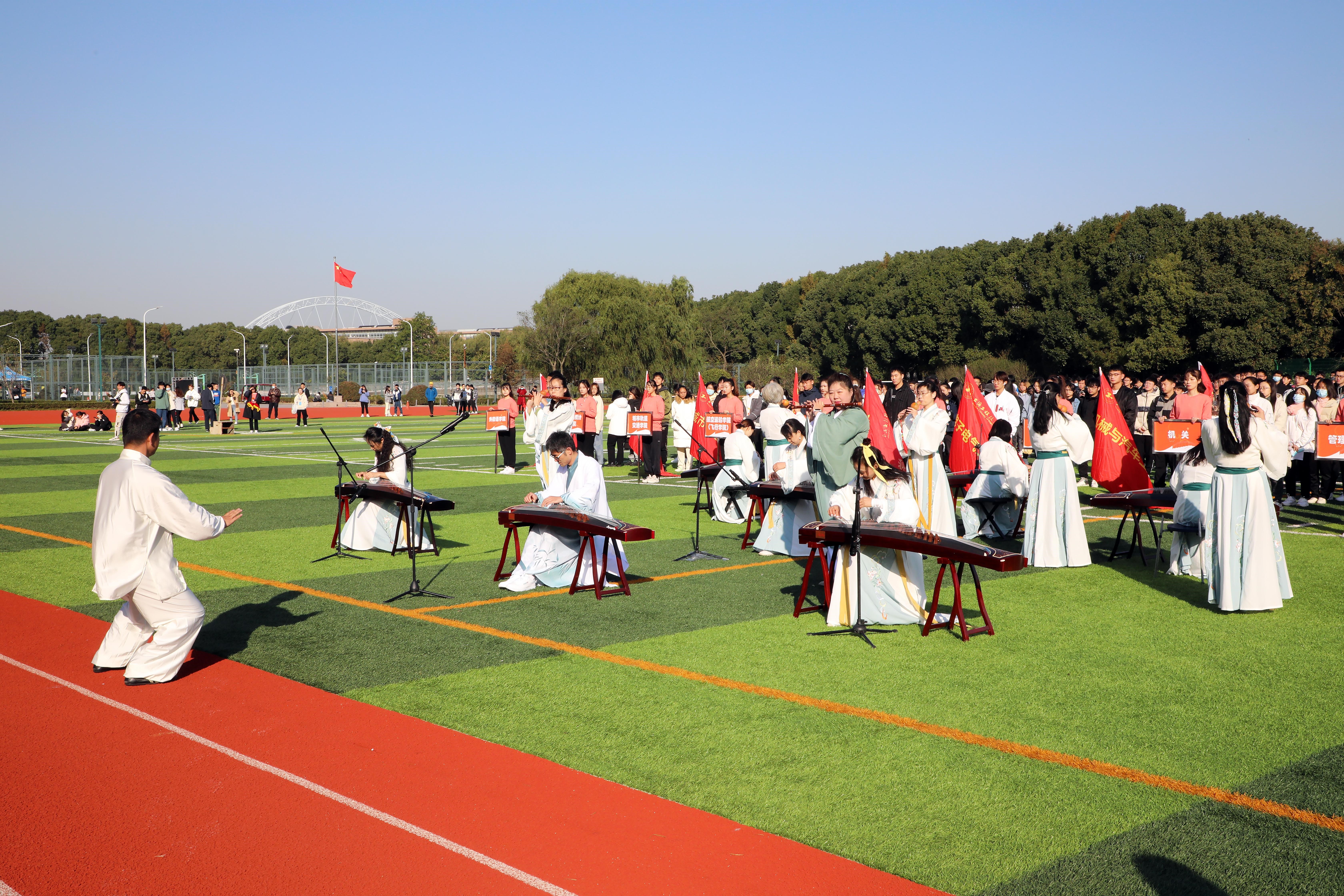 开幕式展演中,由学校教学科研一线骨干老师组成的教工民乐协会与体育教学部徐泽老师共同演绎的《沧海一声笑》,将武术、古筝、笛子、葫芦丝等中国传统文化融入思政育人。校舞龙队、舞龙社的表演《传承》,积极响应体育强国的号召,通过对民族传统文化的传承,为建党百年献礼。由Free–L街舞社和体育舞蹈社带来的表演《绽放青春》,演奏着青春的活力,博得了在场师生的阵阵掌声。