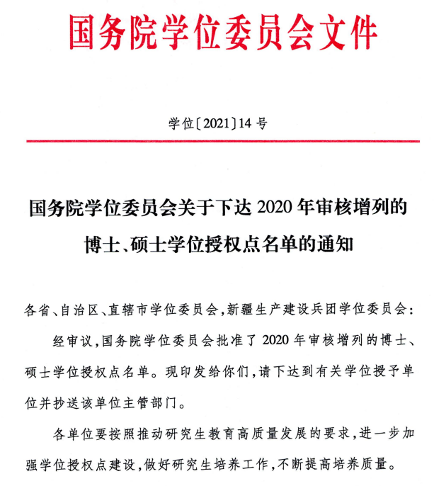 近日,国务院学位委员会发布《关于下达2020年审核增列博士、硕士学位授权点名单的通知》(学位〔202114号),我校获批机械、工商管理、公共管理、资源与环境、材料与化工5个硕士专业授权点。至此,学校已拥有11个一级学科硕士点和8个硕士专业学位类别,涵盖工学、管理学、艺术学、法学、理学等学科门类,形成了工程技术、经济管理和艺术设计协调发展的学位点布局,学科结构进一步完善,专业学位布局不断优化,打造了紧密对接产业链、创新链的高层次应用型创新人才培养体系。