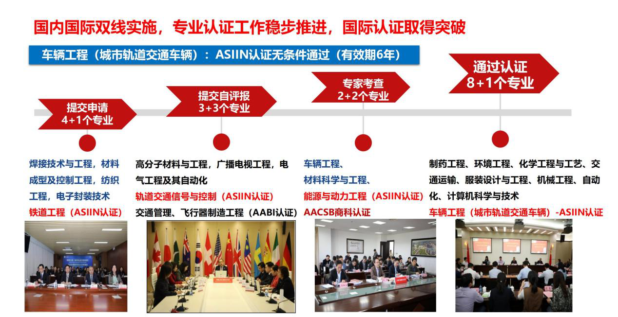 国内认证和国际认证双线实施,成效显著。车辆工程(城市轨道交通车辆)专业获得ASIIN认证无条件通过(有效期6年),车辆工程、材料科学与工程专业完成专家进校考查, AACSB商科认证稳步推进。