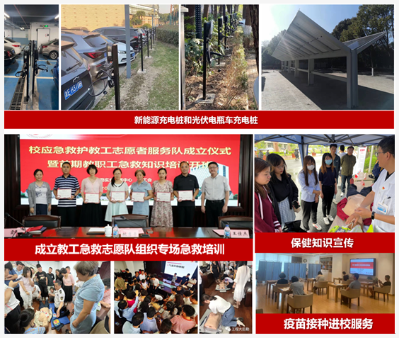 后勤中心整改宿舍楼宇部分供水管道、更换变频水泵,解决了部分学生公寓供水、用水难问题;持续推进“师生健康饮水工程”“草坪照明工程”等项目,安装直饮水机77台,加装了一批庭院灯、草坪灯,节能的同时,更为校园夜色添彩;新增自动贩卖机23处,食堂开售轻食套餐、点心专柜,新增花色菜品,结合传统节日推出的青团、粽子、月饼等深受欢迎;针对师生反映强烈的充电难问题,加装新能源车充电桩39个,光伏电瓶车充电桩80个;与学院共建“校园服务保障统战工作联合计划”,为学生提供更为精准的服务;与校工会联合成立应急救护教工志愿者服务队,组织专场急救培训;开展针对学生的AED培训,宣教防艾知识、大学生医保政策,开展教工体检报告咨询等活动;协调并保障无偿献血工作,全校共计2123人参加,共捐献热血近42万毫升。