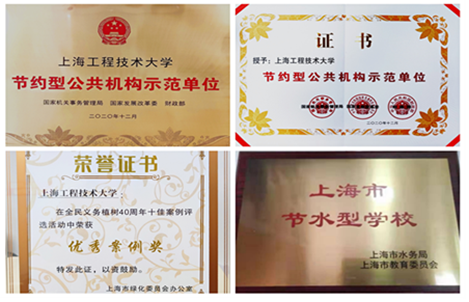 学校获国家机管局、国家发改委和财政部正式授牌“全国节约型公共机构示范单位”,顺利完成“全市能效领跑者”创建工作,学校代表松江区参评全国绿化模范单位称号(创建中)。学校荣获“上海市节水型学校”“上海市全民义务植树40周年十佳案例”“上海高校保供稳价先进单位”“上海市花园单位”等荣誉称号。在2021年下半年全市高校生活垃圾分类实效综合考评中获得第二名,2名同志荣获上海市学校后勤系统“三牛”式优秀管理服务人员称号。