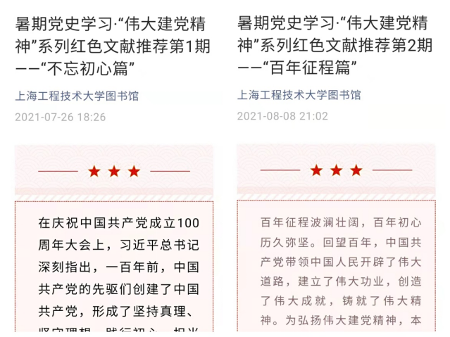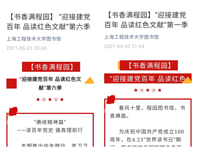 图书馆党支部号召全体支部党员充分利用图书馆资源,借助超星学习通平台,学习阅读红色文献,并撰写阅读体会形成荐读理由,共系统性地开展了六期“迎接建党百年 品读红色文献”荐书活动以及四期暑期“伟大建党精神”系列荐书活动,形成了理论学习和宣传教育的持续效应,探索实践党建引领与业务协调融合发展。